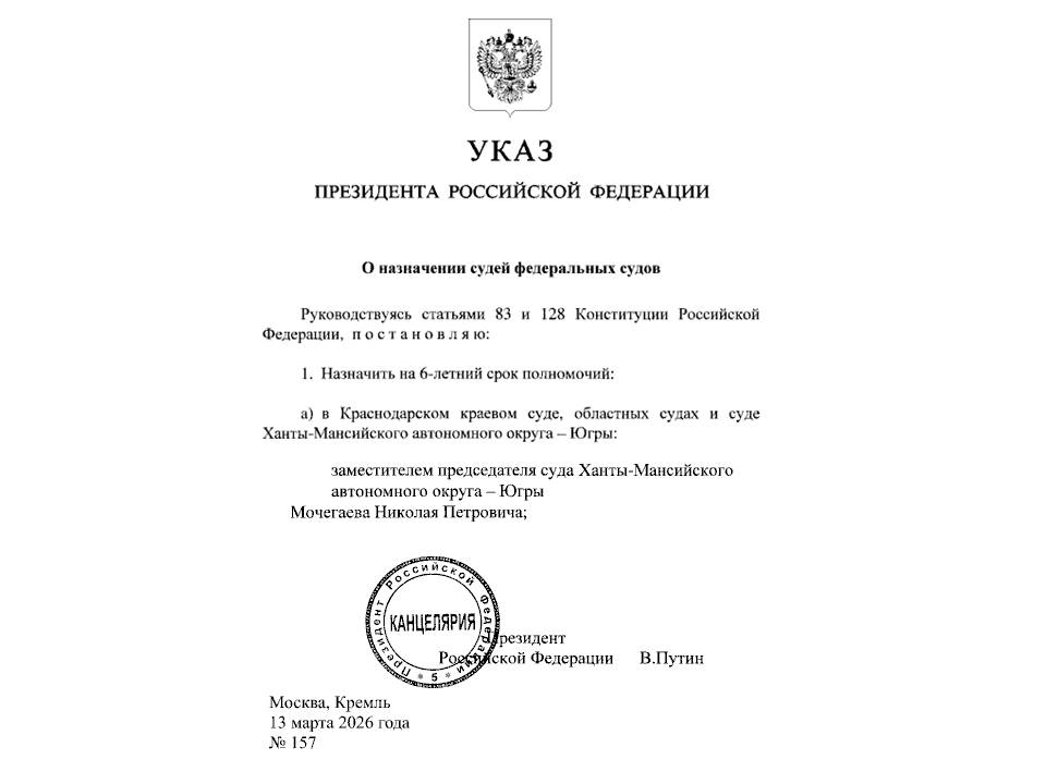 Указом Президента Российской Федерации назначен заместитель председателя суда Ханты-Мансийского автономного округа – Югры 13 марта 2026 года Президент Российской Федерации подписал Указ № 157 «О назначении судей федеральных судов», которым на шестилетний срок полномочий на должность заместителя председателя суда Ханты-Мансийского автономного округа – Югры назначен Мочегаев Николай Петрович. Николай Петрович Мочегаев имеет богатый профессиональный опыт и многолетнюю историю служения правосудию. В 1987 году поступил и в 1991 году с отличием окончил Свердловский ордена Трудового Красного Знамени юридический институт по специальности «правоведение». С августа 1991 года его профессиональная карьера неразрывно связана с судебной системой: Трудовую деятельность в органах юстиции начал с должности стажера народного судьи Первомайского районного народного суда города Кургана. В ноябре 1992 года избран народным судьей Курганского городского суда. Указом Президента РФ от 11 июля 2000 года № 1287 назначен судьей Курганского областного суда. С 2004 по 2007 год являлся председателем судебного состава по рассмотрению административных дел, а затем — председателем судебного состава коллегии по гражданским делам Курганского областного суда. Указами Президента РФ дважды (в 2007 и 2013 годах) назначался на должность заместителя председателя Курганского областного суда. 2 декабря 2014 года вышел в почетную отставку. После ухода в отставку посвятил себя подготовке молодых юристов, работая старшим преподавателем кафедры гражданского права и процесса в Тюменском государственном университете. 4 ноября 2019 года Указом Президента РФ № 540 Н.П. Мочегаев был впервые назначен заместителем председателя суда Ханты-Мансийского автономного округа – Югры. Нынешним Указом от 13 марта 2026 года он переназначен на эту высокую должность на новый шестилетний срок. За многолетнюю безупречную службу Н.П. Мочегаев отмечен многочисленными наградами, среди которых: - Медаль «За заслуги перед судебной системой Российской Федерации» II степени (2013 г.); - Медаль «За безупречное служение правосудию» III степени (2023 г.); - Медаль Федеральной службы судебных приставов «За заслуги»; - Благодарность Совета судей Российской Федерации, а также ведомственные награды, включая представление к награде МЧС России «За содружество во имя спасения». Николай Петрович имеет первый квалификационный класс судьи. Коллектив суда Ханты-Мансийского автономного округа – Югры поздравляет Николая Петровича с назначением и желает дальнейших успехов в укреплении законности и правосудия!