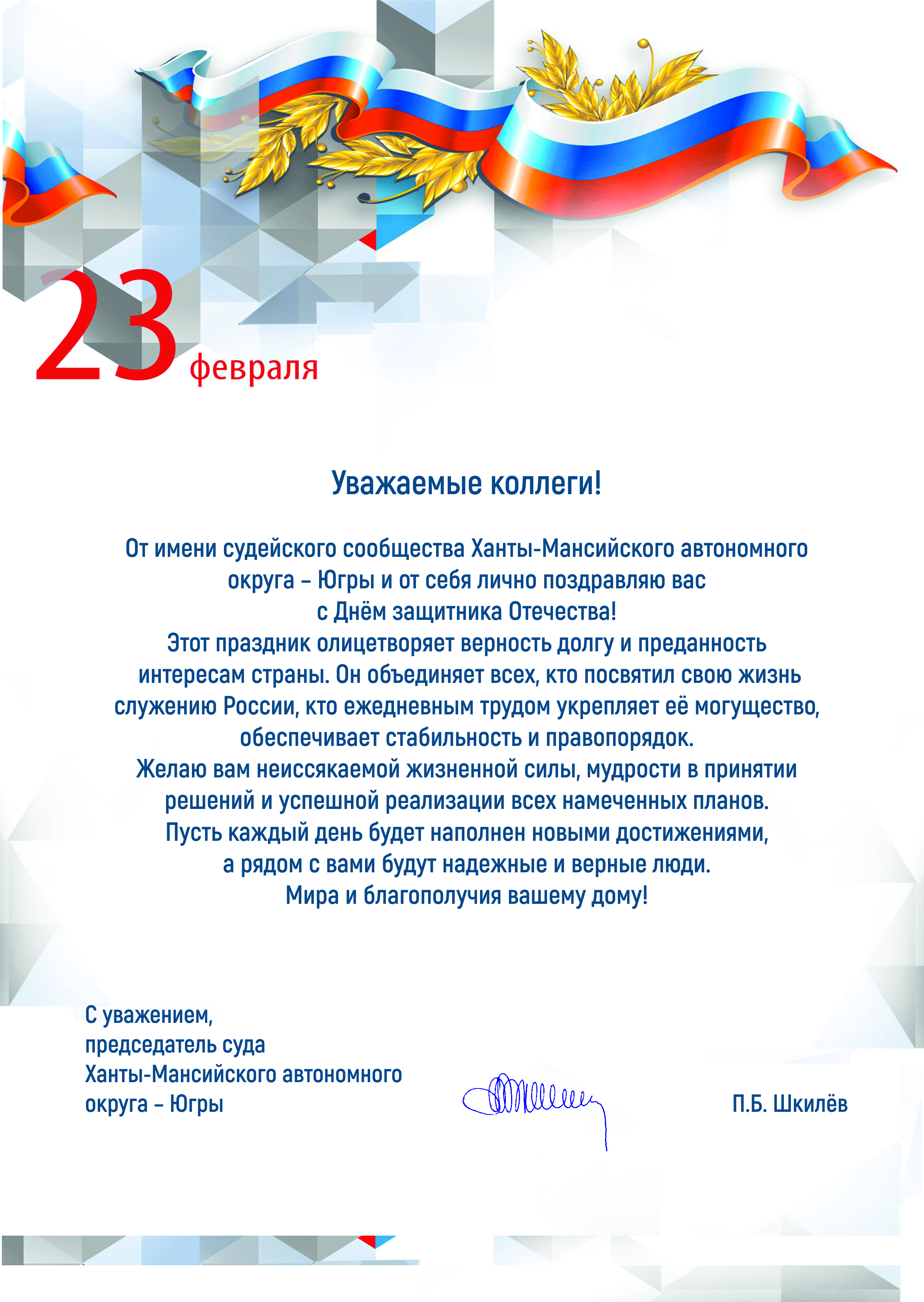 | Поздравление председателя суда Югры П.Б. Шкилёва с Днём защитника Отечества | версия для печати |
